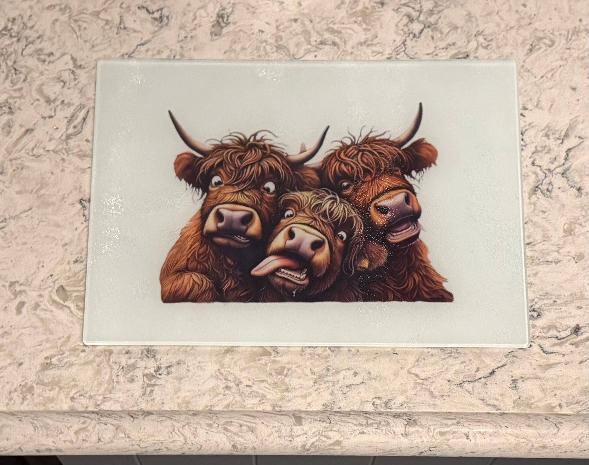 Large Glass Chopping Board, Highland Cows being Silly, Sublimation, Worktop Saver, Funny Faces