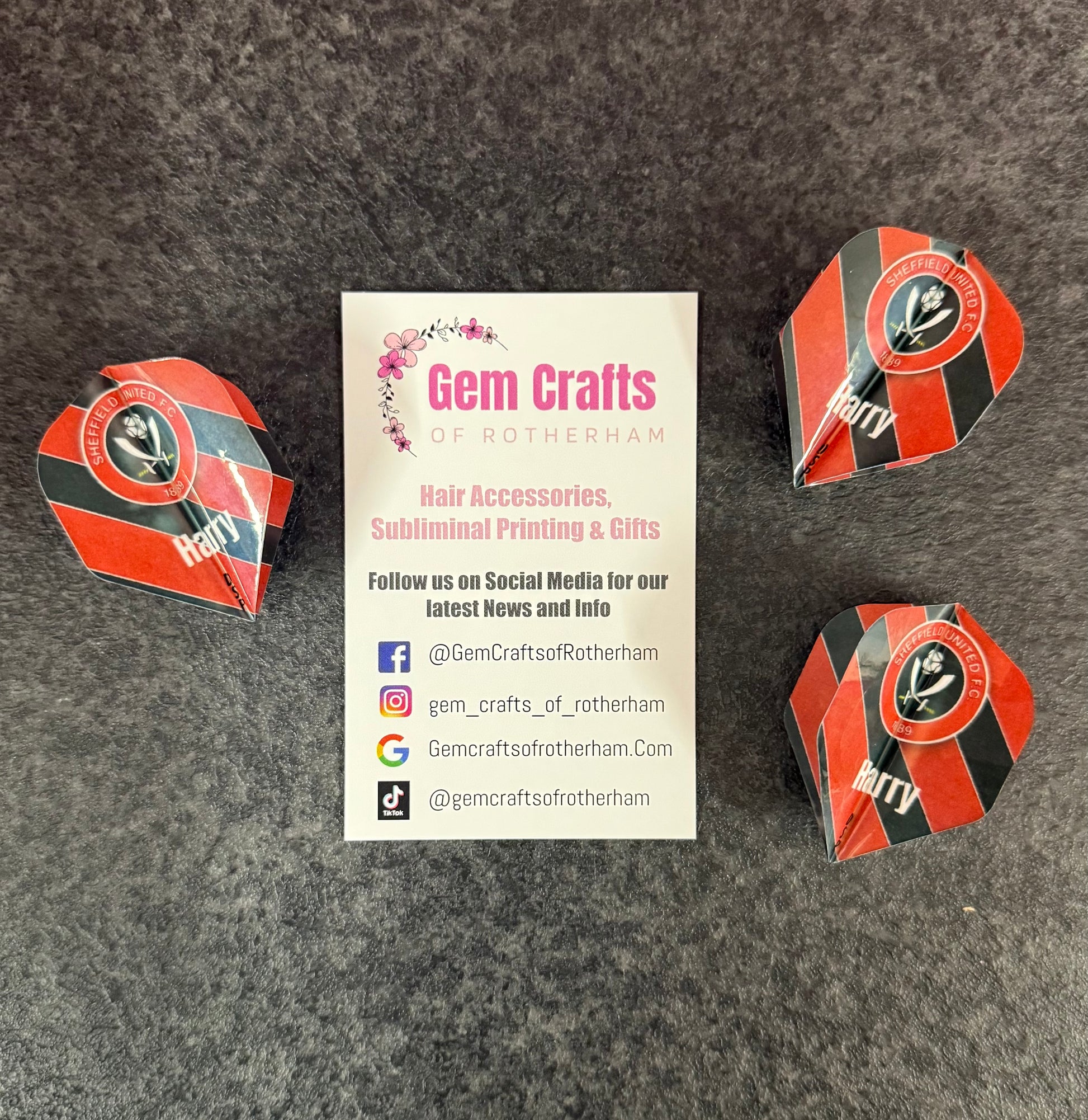 Our Dart flights are design and created by Gem Crafts of Rotherham and hand made to order in our workshop for a truly unique gift. We can add any text for your special occasion, We can add names to a design or change details as they are not yet made, we print them to your choosing once ordered